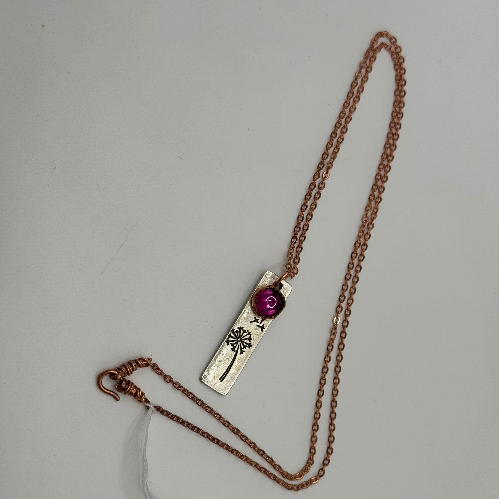Silver dandelion pendant with 8mm rose pink Swarovski cabochon set in copper with matching 20” copper chain