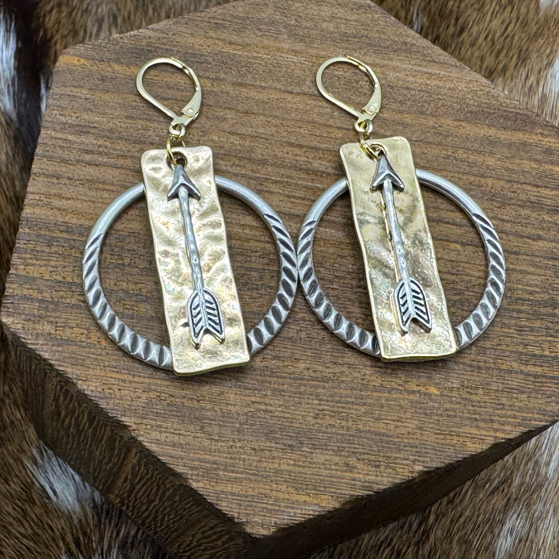 Gold plates with silver arrows on textured silver hoops with gold lever backs