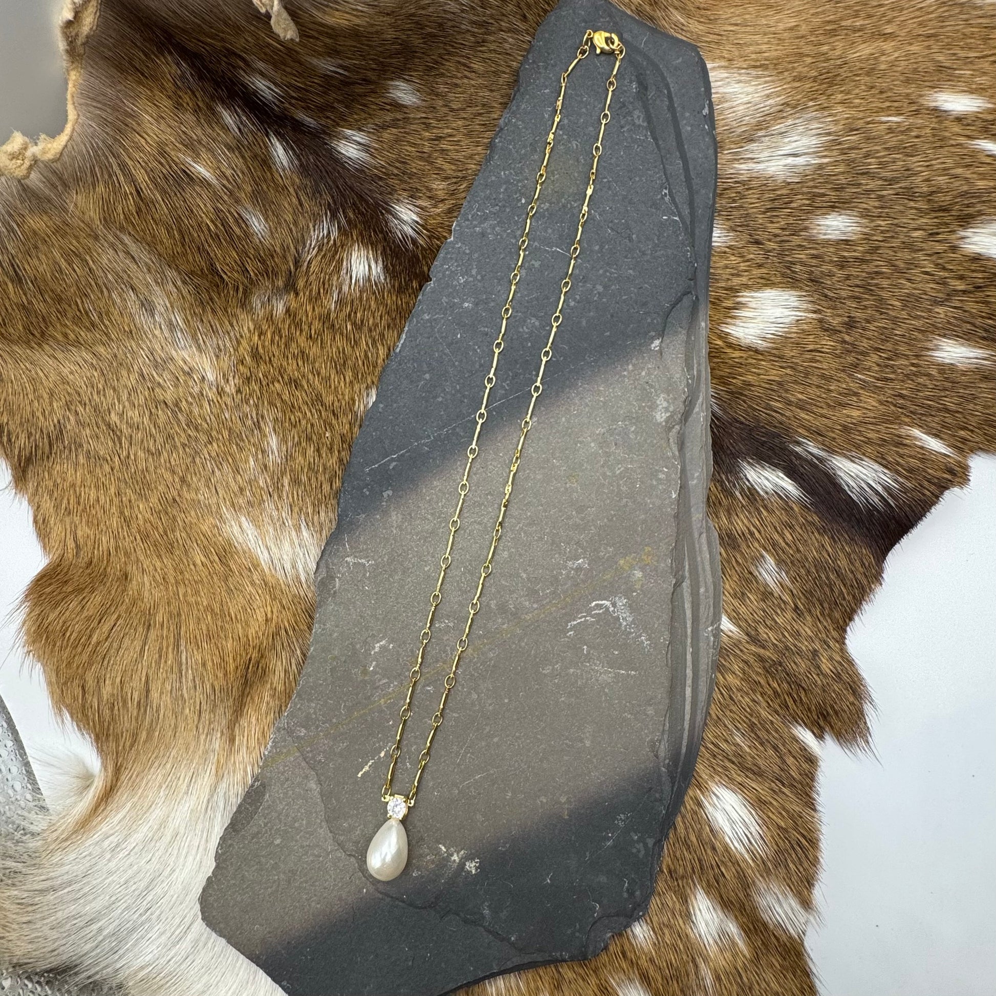 Pearl (medium) and cubic zirconia (large) on 18” bar link gold plated chain